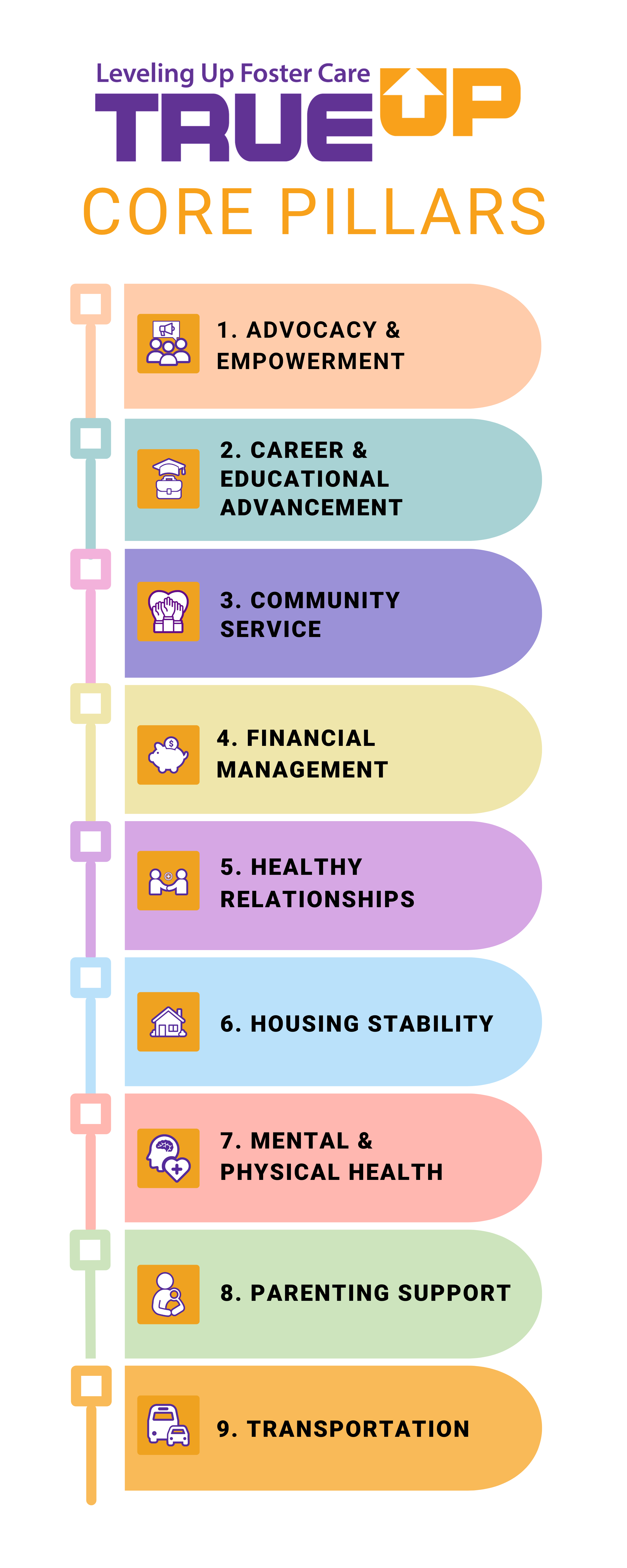 By focusing on these pillars, True Up equips foster youth with the skills, resources, and support they need to thrive as they transition to from structured environments to independent living. Each pillar plays a crucial role in ensuring success and well-being. As we continue to make strides, we invite other organizations and community partners to join us in this mission. Your support can make a significant difference in the lives of former foster youth, helping them build a brighter, more self-sufficient future. If you are interested in learning about more ways you can support foster youth and alumni by becoming a Champion for foster youth.